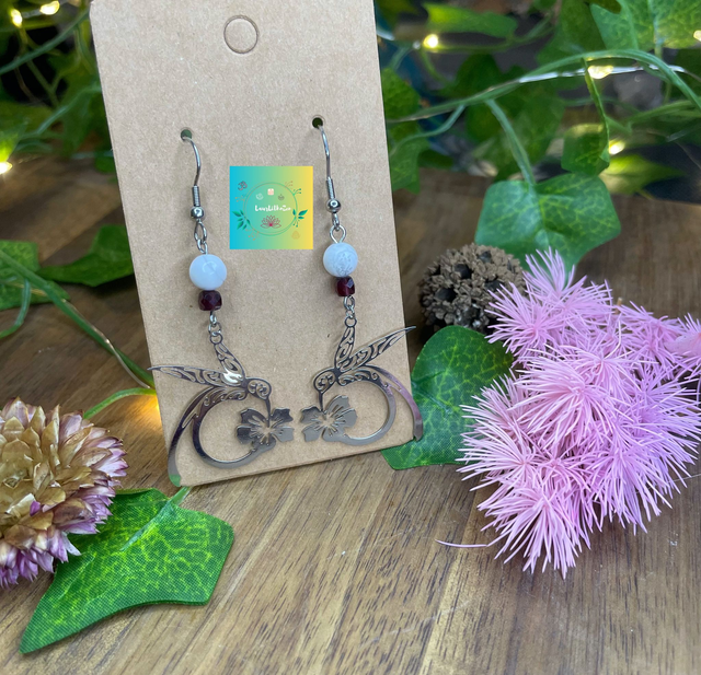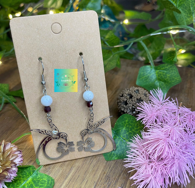 🕊🌹 Boucles d'oreilles Colibri en Grenat et Howlite