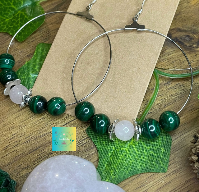 đ Boucles dâoreilles crĂ©oles, en perles Malachite et Quartz rose 8mm