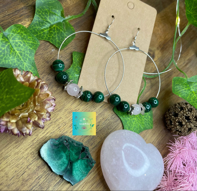 đ Boucles dâoreilles crĂ©oles, en perles Malachite et Quartz rose