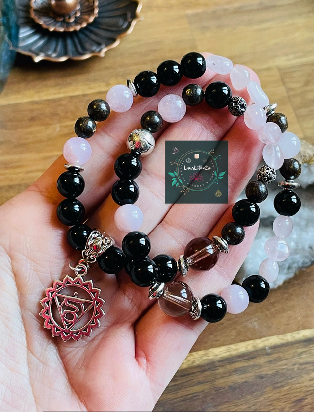 Double Bracelet en Quartz rose-Onyx -Quartz fumé et Bronzite